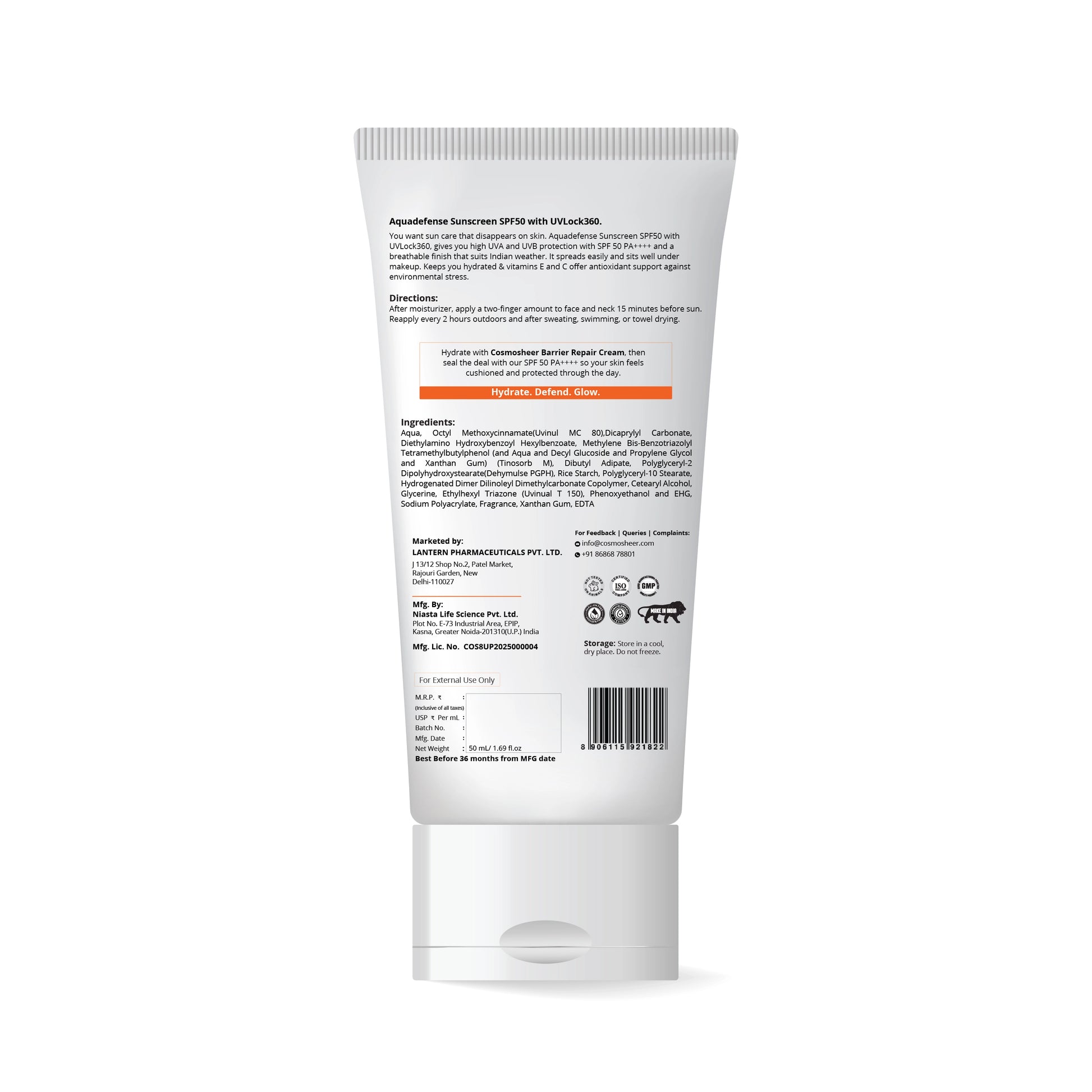 Cosmosheer Aquadefense Sunscreen (SPF 50 PA++++) | Broad Spectrum UV Protection (UVA & UVB) | Super Hydrating, Lightweight Formula | Suitable for All Skin Types | 50 ml | Water-based Formula