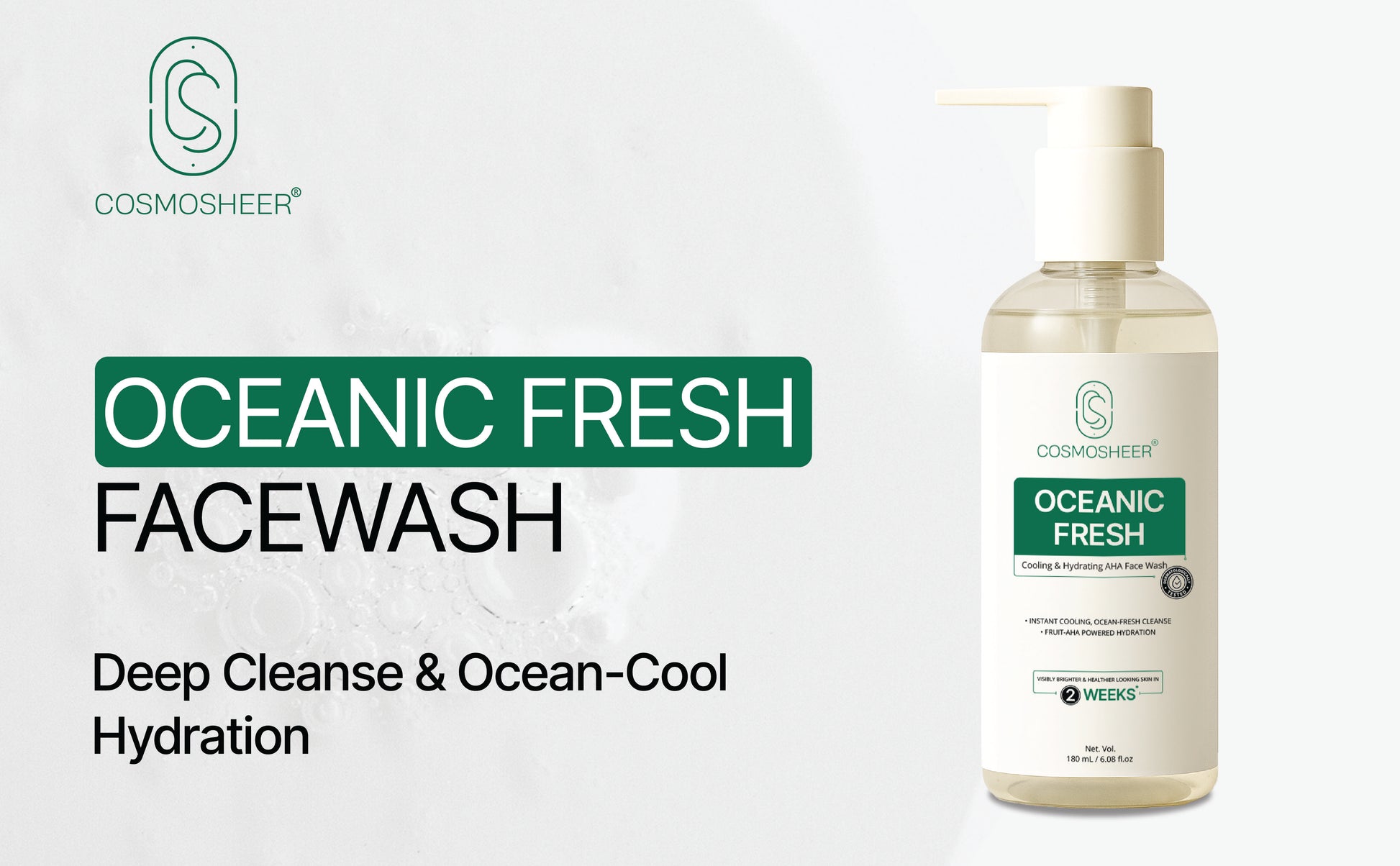 Imagine the sensation of fresh ocean waves touching your skin. Cosmosheer Oceanic Fresh Facewash, powered by MattiCool Tech™, gently cleanses away dirt, oil, and impurities while delivering a refreshing cooling effect. Infused with AHAs, Aloe Vera, and Niacinamide, it helps exfoliate dead skin cells, hydrate deeply, and brighten your complexion — leaving your skin calm, soft, and ocean-fresh after every wash.